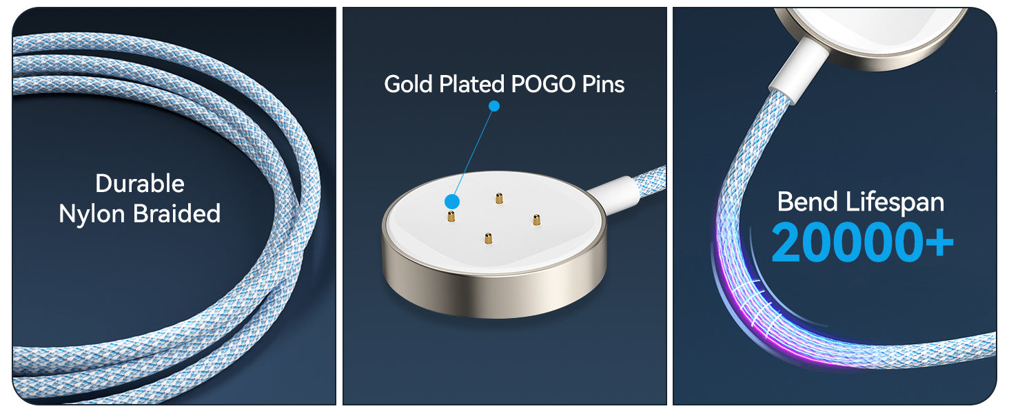 The fitbit versa 4 dock designed with a braided nylon insulation and precision layered welded connectors, it has been tested to over 20,000+ bending test and 10,000+ insertion/extration test, and the edge of the stand is surrounded by metal, make this cable more durable and stronger than regular fitbit watch charger cables, while being flexible and tangle-free.