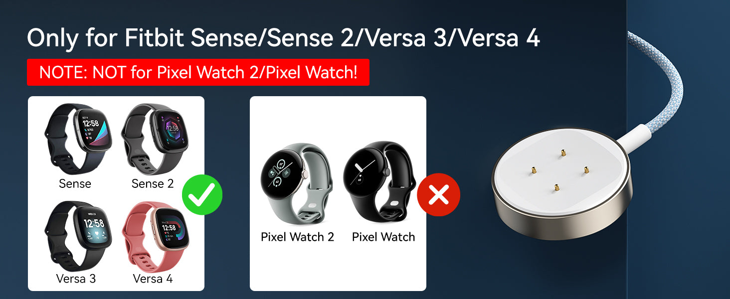 The charger cable specially designed for Fitbit Sense 2/Sense/Versa 4/Versa 3. NOTE: DOES NOT fit for Fitbit Versa 1, Versa 2, Versa Lite; DOESN'T for Pixel Watch/Pixel Watch 2. A necessary accessories for your smartwatch.