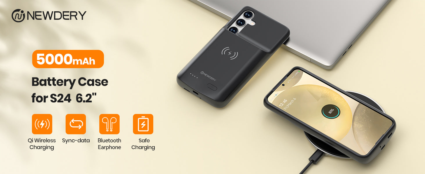 NEWDERY Battery Case for Samsung S24, Qi Wireless Charging, Fast Charging, Sync Data Supported, 5000mAh Portable Rechargeable Charger Case Battery Pack for Galaxy S24 5G 6.2"