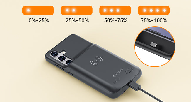 8. The led will flash when charging the s24 battery case via the cable, When the charging case is fully charged, the four led indicators will be on.
