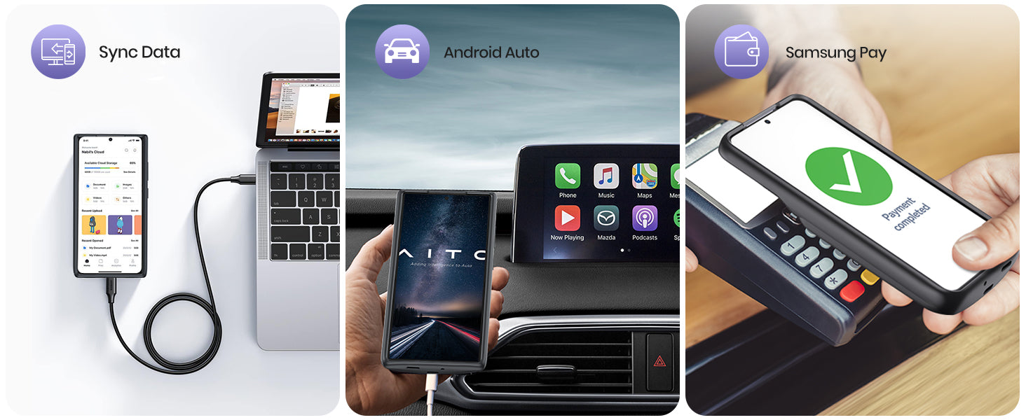 Be free use all function of Galaxy S24, you can enjoy the fun and convenience of Android Auto, NFC and transfer data without removing the battery pack. Please use the USB-A To USB-C cable to transfer data and use android auto.