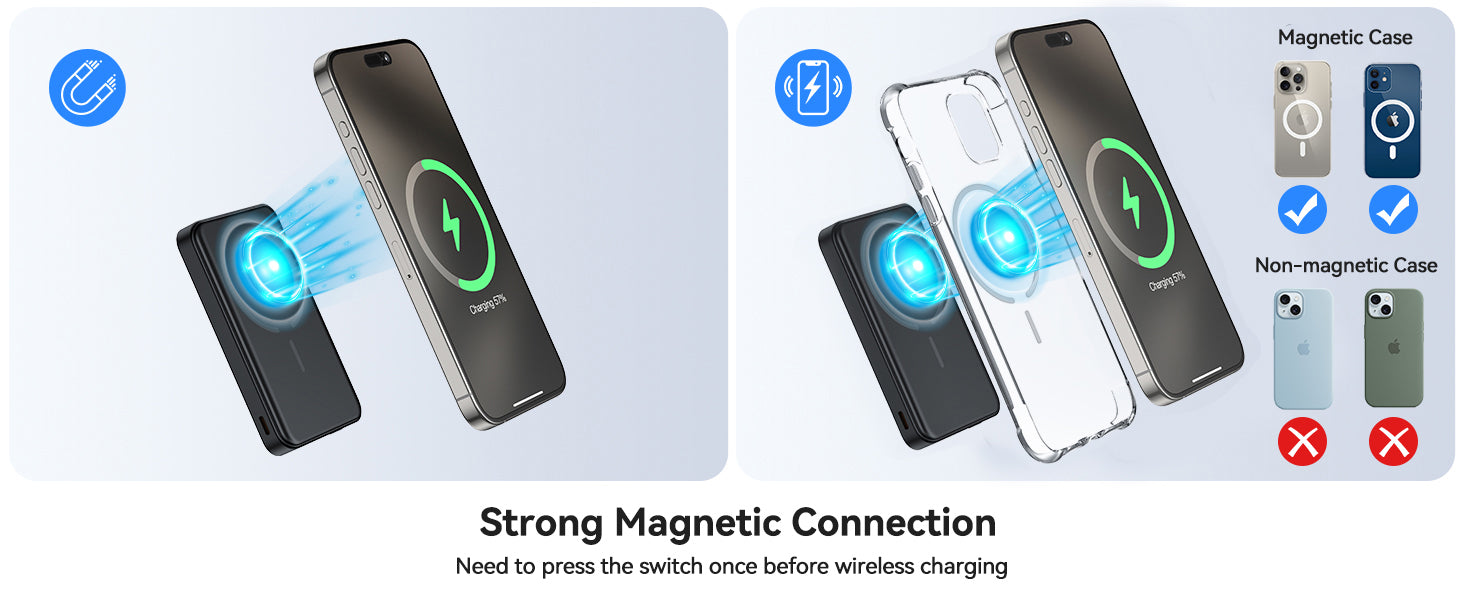 The magnetic portable charger with built-in magnetic module can be connected to your device for safe and reliable wireless charging. With its super-strong magnet, aligning the phone and the battery pack is effortless. One-click button to start wirelessly charging and double-click to stop. (Compatible with Magnetic cases or without cases)