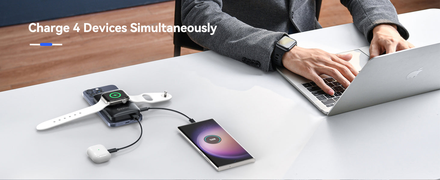 2. Multi-devices Charging: Supports four devices to charge simultaneously via wireless and wired charging.
