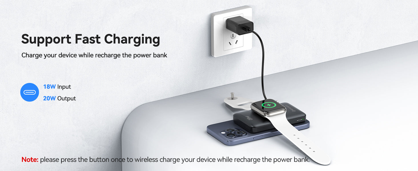 6. Pass-througth Charging: Please press power button once to wireless charge your iwatch while recharge the wireless charger battery pack .