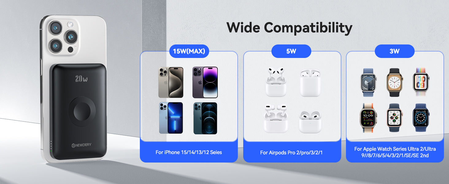 1. Wide Compatibility: The magnetic battery pack is designed for iPhone 15 pro max/15 pro/15 plus/15/14/13/12 series, compatible with apple watch series ultra 2/ultra/9/8/7/6/5/4/3/2/1/se/se 2nd, airpods pro 2/pro/3/2/1,ipad pro/air, tablets, Galaxy Z Flip/Z Fold/S24 Ultra/S24 Plus/S24/S23 Ultra/S23 Plus/S23/S22/S21/S20/note 20/note 10 series other smart devices.