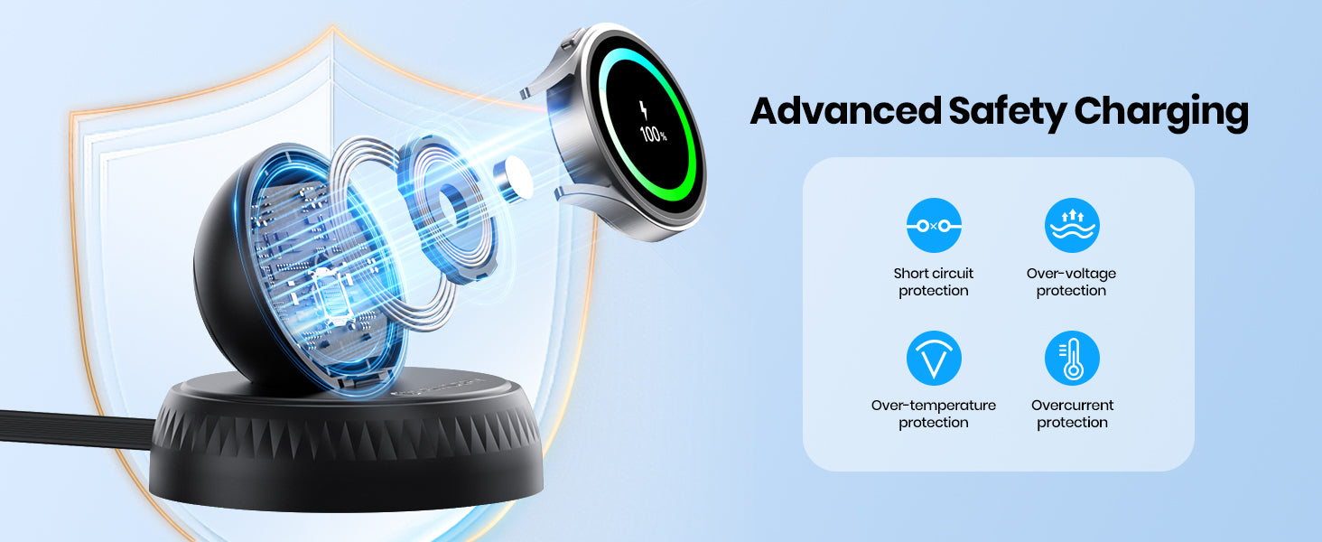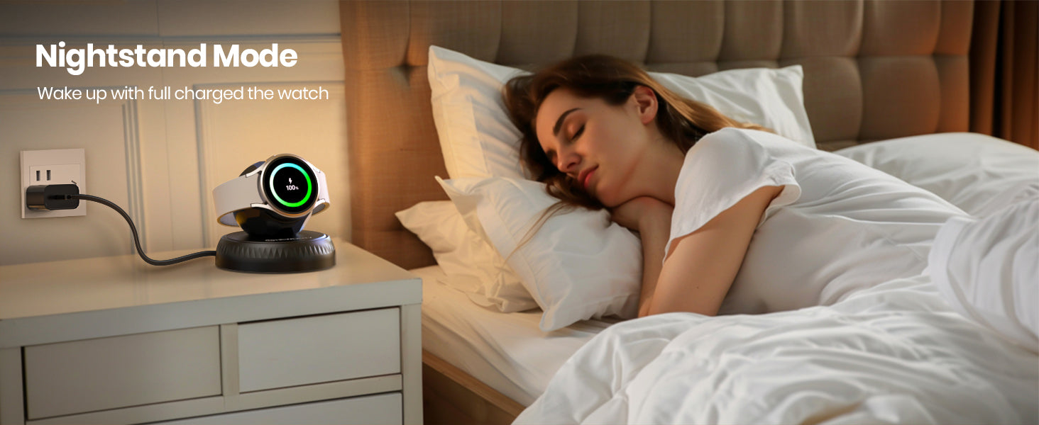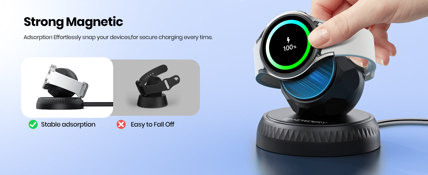 This for Samsung galaxy watch charger stand has a built-in strong magnetic that can firmly attach the watch to the center of the Replacement watch charger,ensuring perfect alignment and efficient charge.