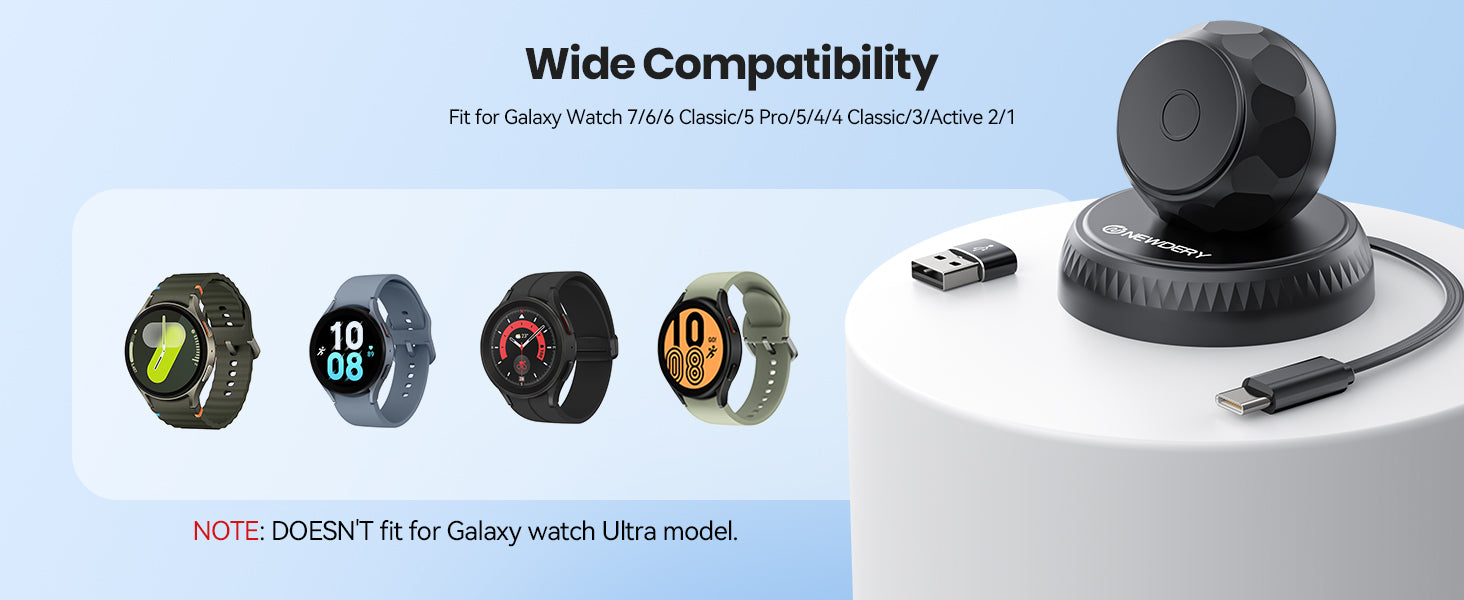 The charging station is widely compatible with samsung galaxy watch 7,6,6 Classic,5,5Pro,4,4 Classic,3,Active 2,1. (Not for Galaxy watch ultra/Gear S2/S3/S4).