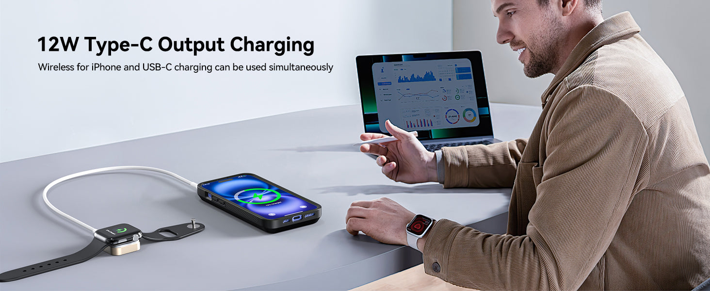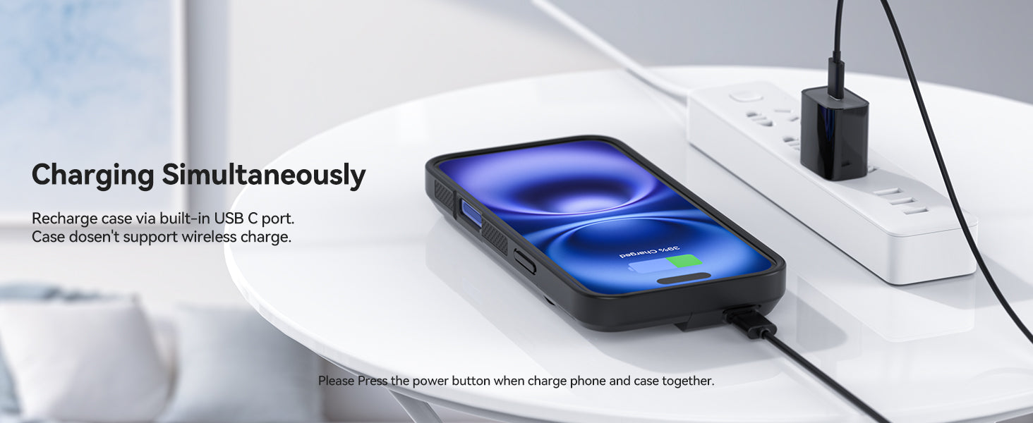 Based on advanced chips, charging port has dual functions of input and up to 12W power out. Charger case supports simultaneous charging: ① Recharging the case while wirelessly charging for iPhone 16 Plus ②Wireless and USB-C charging can be used simultaneously