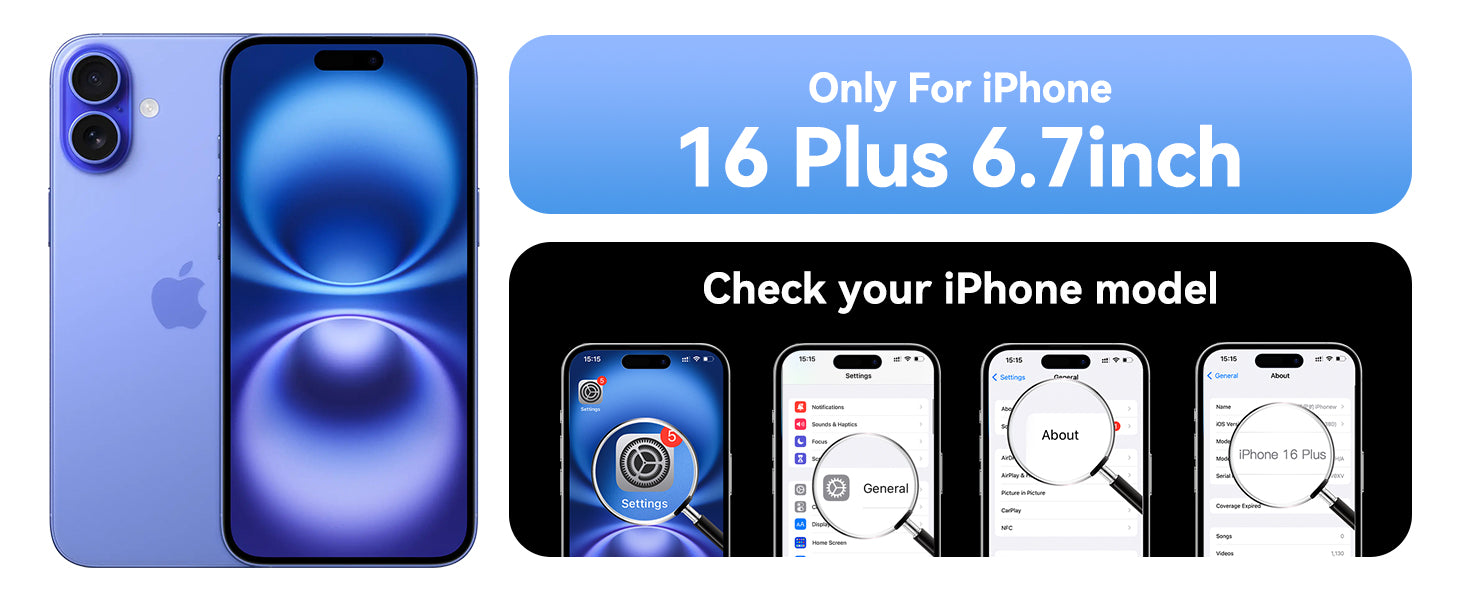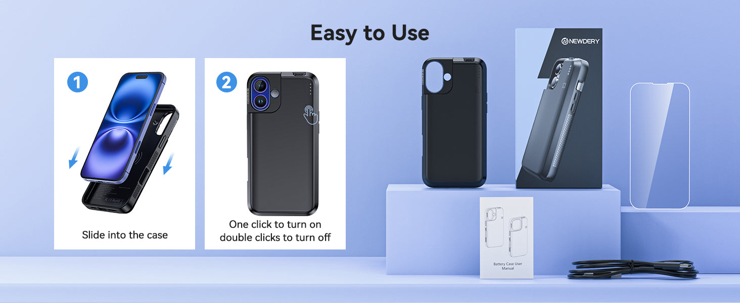 Just slide your 16 Plus into the case for a snug fit. One click starts charging, and double click stops all charging. For iPhone 16 Plus battery case has 4 LED indicators to track battery life (0%-25%-50%-75%-100%). You will get: 1* 8000mAh battery case, 1* protective film, 1* C to C cable, and 1* user manual