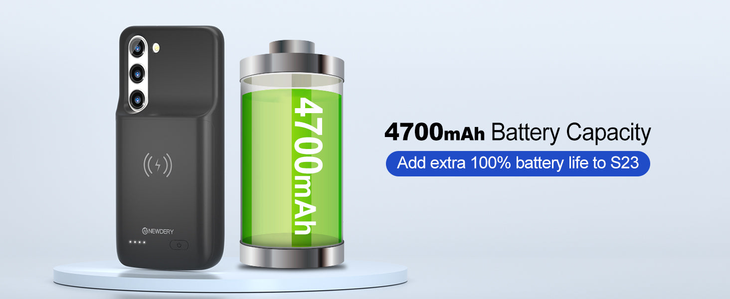 The S23 charger case with a 4700mAh Li-polymer battery, powerfully extended 100% battery life for your S23 5G. Say goodbye to low battery anxiety and awkward moments. Ideal for traveling, camping, business trip or other outdoor occasions.