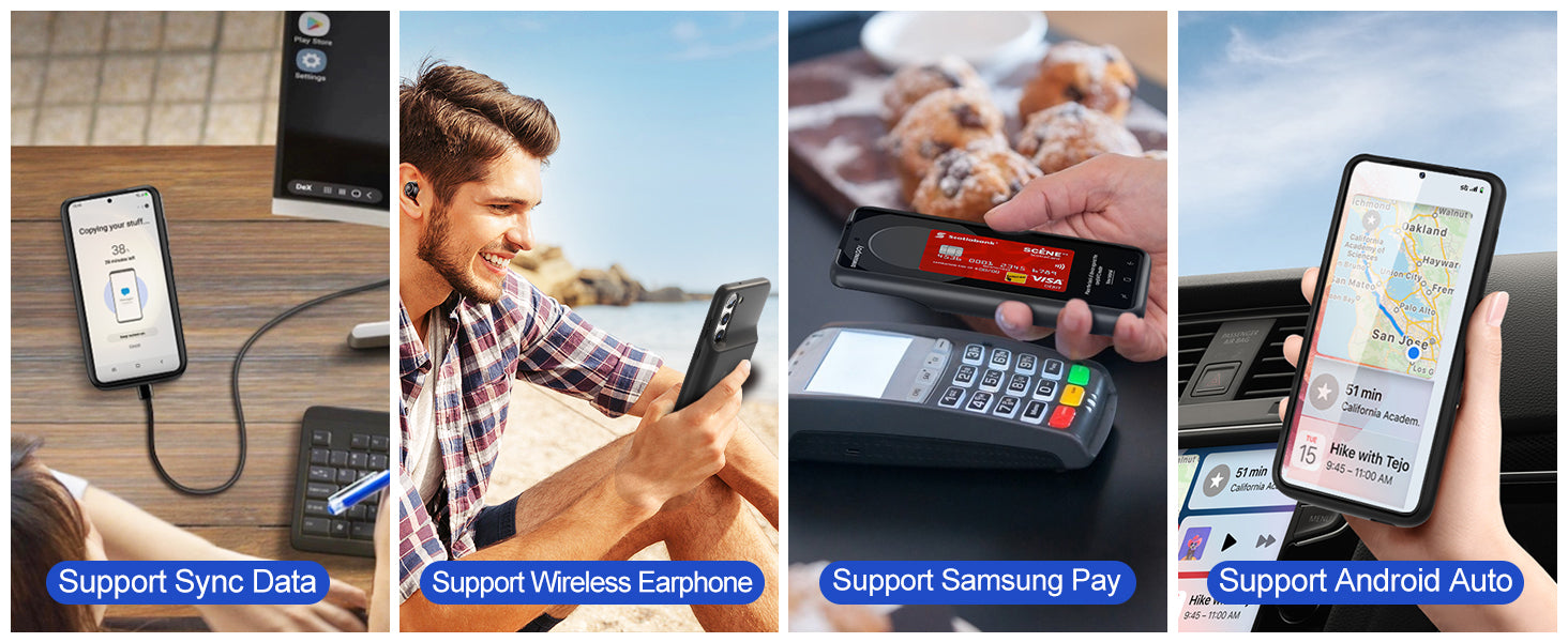 Be free use all function of Galaxy S23, you can enjoy the fun and convenience of Android Auto, NFC and transfer data without removing the charging case. Please use the USB-A To USB-C cable to transfer data and use android auto.