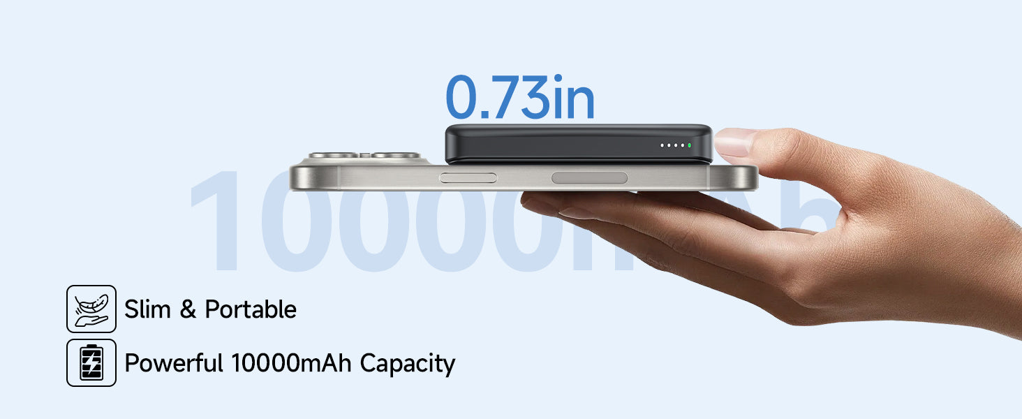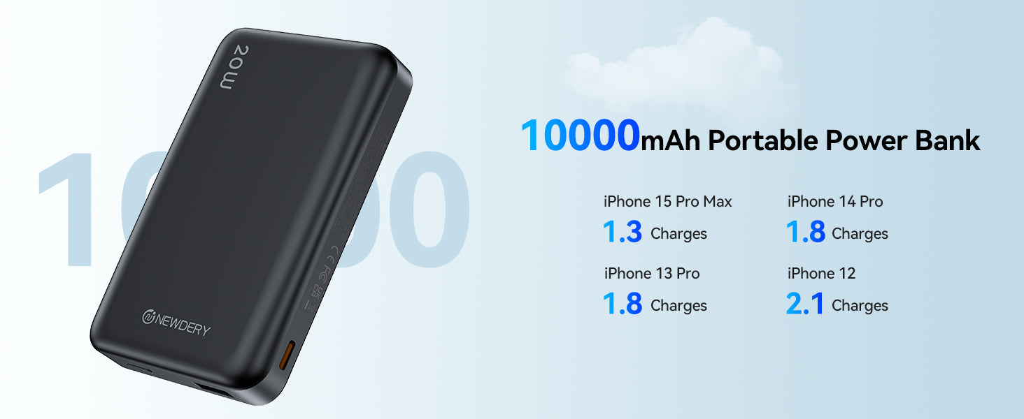 The power bank for iphone built with 10000mAh capacity, can charge your iPhone 15/14 Pro Max to 1.3 times, iPhone 12 to 2.1 times and iPhone 13 to 1.8 times. The iphone portable charger powers your phone for whole day, perfect for travel.