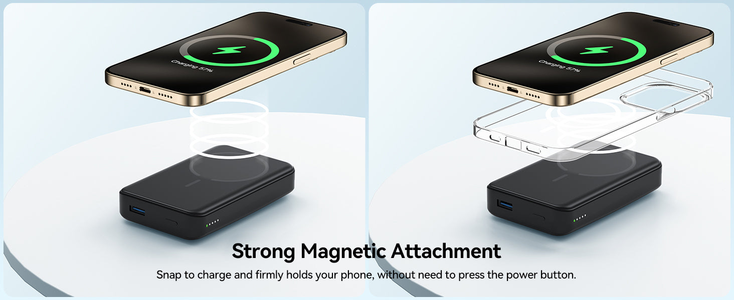 The Magnetic charging is designed for iPhone 15/14/13/12/Pro Max/Pro/Plus/Mini. NEWDERY portable charger built in magnetic modules which helps to snap your phone and automatically to charge, it will keep your phone attached. Don’t need to press the power button to charge and double clicks to trun off the power bank. (If you charge your phone via wired cable, please press one click the power button to charge.)