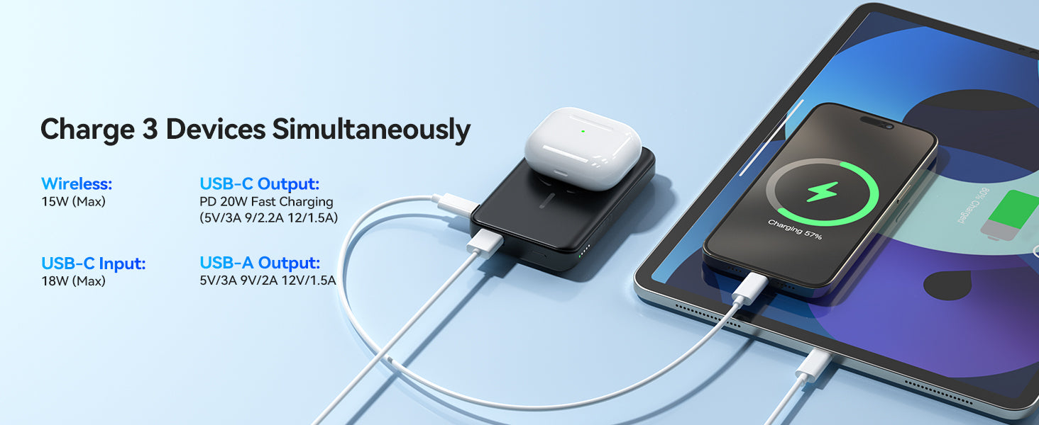 The USB-C port supports PD 20W fast charging, which it can charge the iPhone 15 from 0% to 100% in just 1.5 hours, and 18W max input and pass-through technology(you can recharge the battery pack while charging phone); The output for USB-A port is 5V/3A 9V/2A 12/1.5A. It is convenient to charge your 3 devices simultaneously.