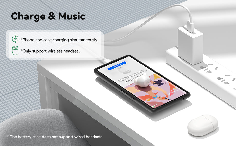 ONLY compatible with Google Pixel 6 Pro, NOT FOR Google Pixel 6. NOT support wired headset. Compatible with wireless headsets, enjoy your Audio & Music anytime while Charging. You can also charge the battery case and your Pixel 6 Pro simultaneously with the original charging cable.