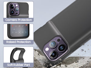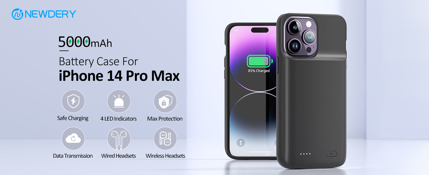 ① This battery case only for iPhone 14 Pro Max/14 Plus/13 Pro Max/12 Pro Max. ② Built-in 5000mAh Li-polymer extended battery, double your phone power life, say goodbye to the low battery life. ③ Support the Bluetooth earphone and wire earphone.