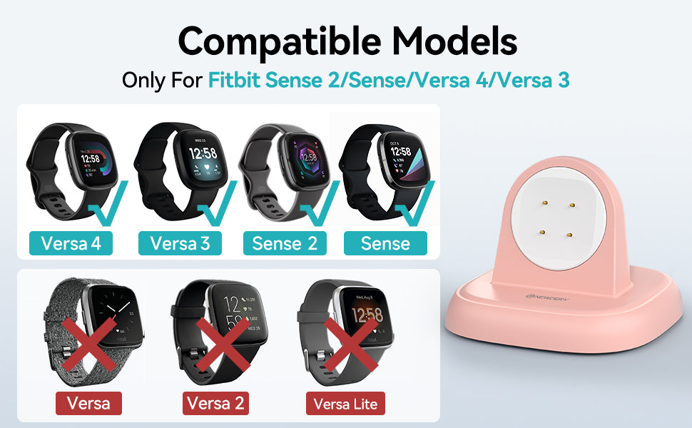 1. Compatibility: the charger dock only work for Fitbit Sense 2/ Fitbit Sense/Fitbit Versa 3/Fitbit Versa 4