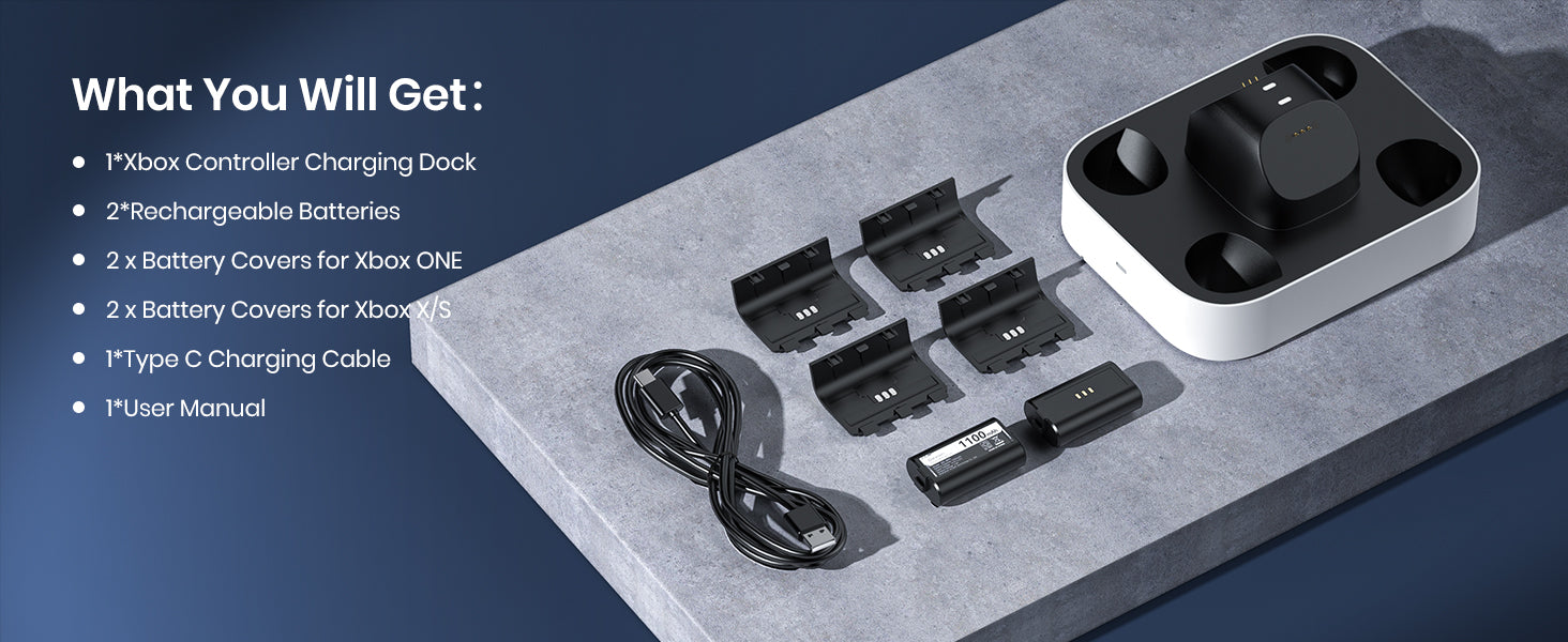 1*Xbox Controller Charger Station; 2*1100mAh Rechargeable Battery Packs; 2 x Battery Covers for Xbox ONE X|S; 2 x Battery Covers for Xbox Series X|S; 1*3.3FT Type-C Charging Cable; 1*User Manual. If you have any questions about our products, please contact us in time to help you better, your satisfaction is our greatest motivation.