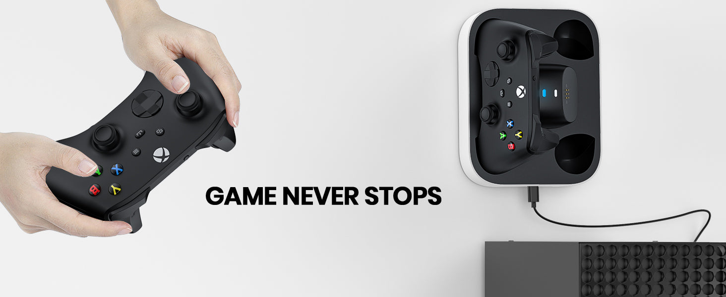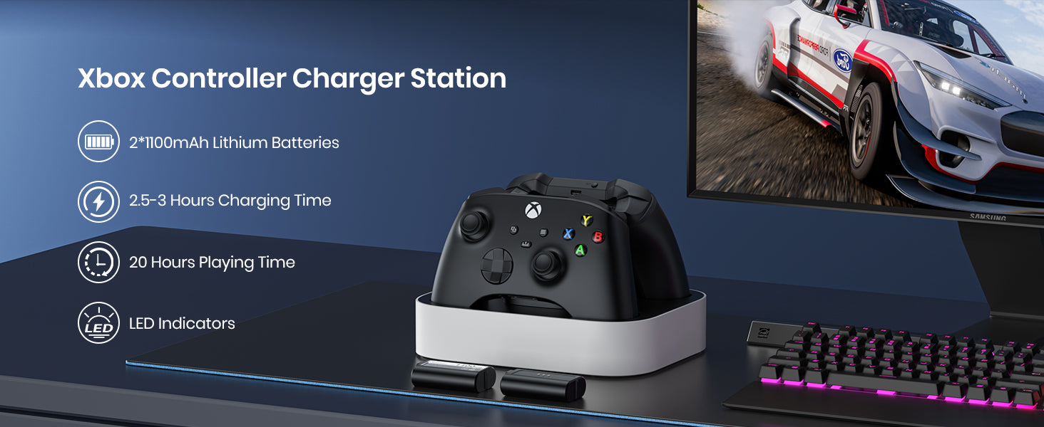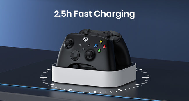 The xbox series x controller charger station can simultaneously charge two controllers. There are two 1100mAh Rechargeable Battery Packs with the same capacity as the official original battery, it only takes 2.5-3 hours to fully charge, and you can play games up to 20 hours. Our eco-friendly 1100mAh rechargeable battery packs for Xbox can be recharged over 3500 times,and it's time to say goodbye to the disposable batteries to save your money and time