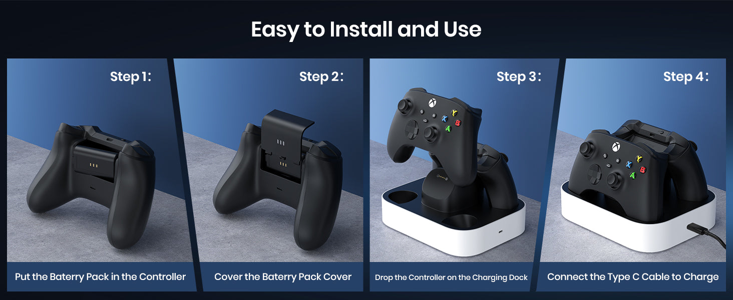 The controller charger dock with dual battery packs is designed for Xbox One, Xbox One X, Xbox One S, Xbox Series X, Xbox Series S. Equipped with 4 battery covers, 2 for Xbox One X|S, and 2 for Xbox Series X|S, Which can meet the charging needs of different series of controllers.(Not Fit For Xbox Elite|360 Controllers)